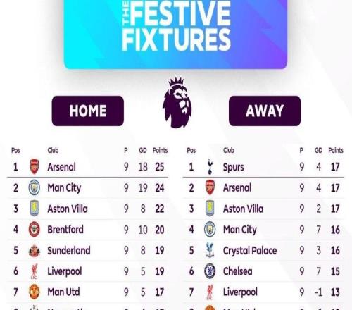 据数据显示,在英超联赛已进行的9个主客场比赛中,各队表现呈现巨大差异。阿森纳凭借主场25分的强势表现领跑主...