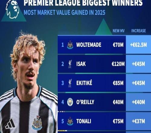 北京时间12月25日,德转列出了英超球员中2025年涨幅最高的10名球员,今夏加盟纽卡斯尔联的沃尔特马德过去这一年...