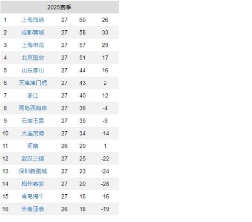 中超最新积分榜