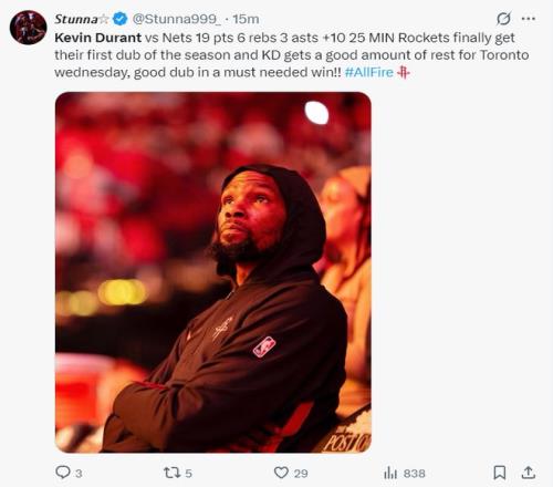 KD25分钟打卡终露笑容!火箭迎首胜美球迷仍存不满休媒赛后解释