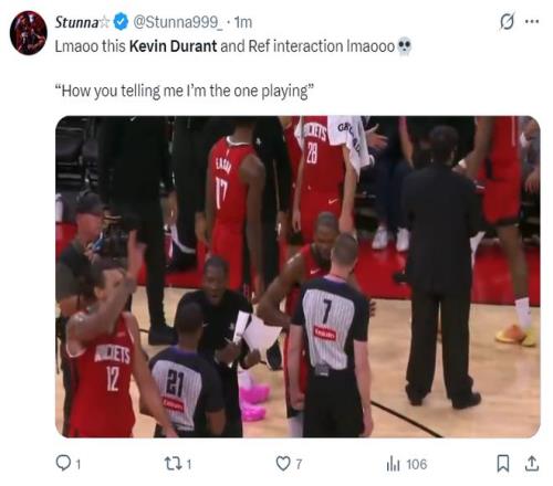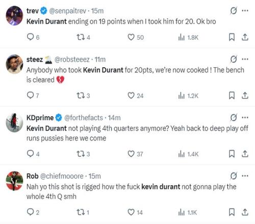不少美国球迷对于杜兰特三节打卡十分不满,因为他们都希望杜兰特能拿到20+的数据,因为NBA陷入涉赌丑闻中,这些球迷都觉得杜兰特第四节被DNP有球场之外的因素。(但实际上火箭领先30+了没必要上杜兰特)