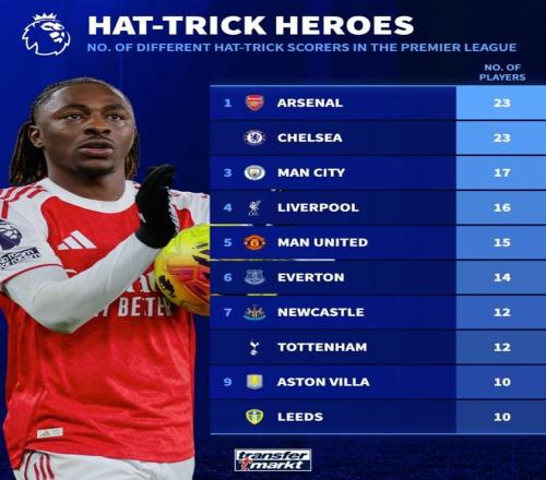 北京时间11月24日,在埃泽用一次帽子戏法帮助阿森纳主场4-1大胜托特纳姆热刺之后,德转统计出了英超联赛历史上戴帽人次最多的10支球队,阿森纳、切尔西同以23名球员戴帽并列第一。